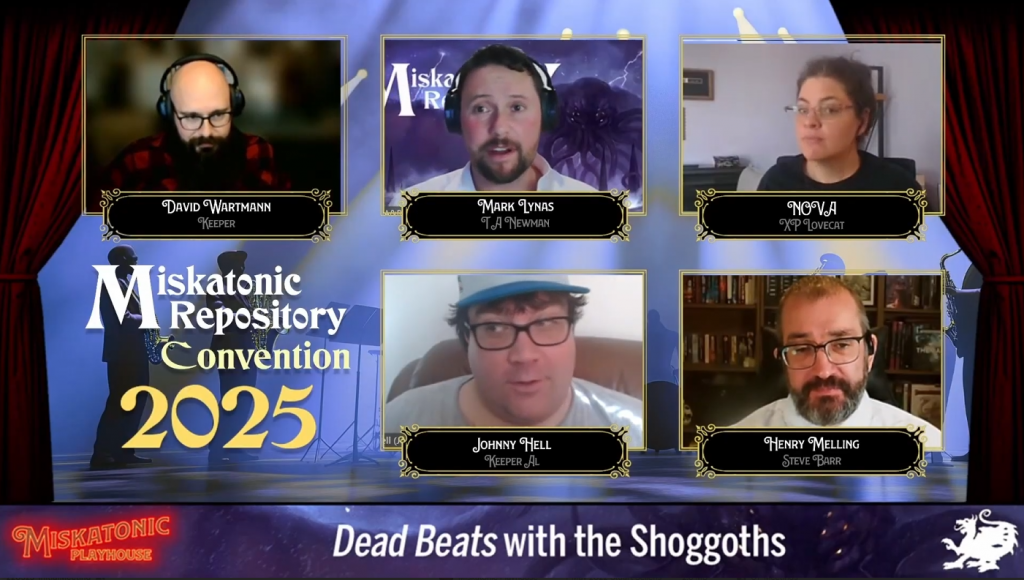 Well it was a hive of activity as I was doing the Miskatonic Repository convention where I was fortunate enough not to have a very good Internet connection so Miranda and Steve across the pond were able to take up the twitch duties. I just had the fun task of putting together the Syrinscape audio for Dead Beats the “council of shoggoths” game where, well no spoilers here at Roll4Sanity so let’s say council inspectors, music journalist, singers and an A&R Man and don’t do too well when things happen in the punk rock club. It was good fun putting together the sound sets and it’s brilliant when you get to perform the ounds. Strange but when you’re listing to the cues from the keeper (which rarely ever come) then play some sounds and get a little bit of ‘Ooo’ from the players that’s always nice.